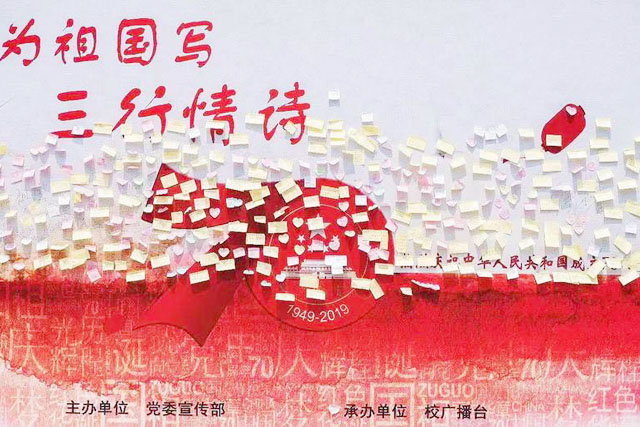 在活动现场,师生们手拿"我爱你,""与国同梦,一路同行""砥砺奋进,牢记使命"等告白牌,在"我与国旗合个影,我为祖国送祝福"的主题布景板前打卡留念。不少人还提笔用便签写下三行情诗,表达对对祖国诚挚的热爱与祝福。一张张灿烂的笑容在布景板前绽放定格,一幕幕正能量满满的画面汇成浓浓的爱国情意。